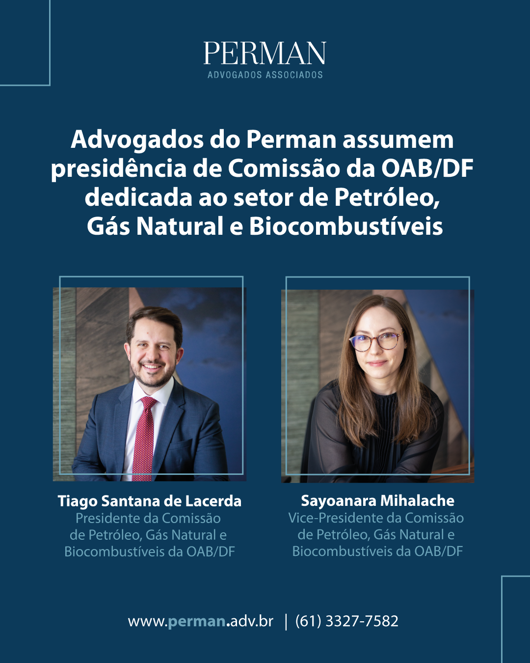 É com grande satisfação que o Perman Advogados parabeniza seus advogados Tiago Santana de Lacerda e Sayoanara Mihalache pela nomeação para a presidência e a vice-presidência, respectivamente, da Comissão de Petróleo, Gás Natural e Biocombustíveis da Ordem dos Advogados do Brasil – Seccional do Distrito Federal (OAB/DF).